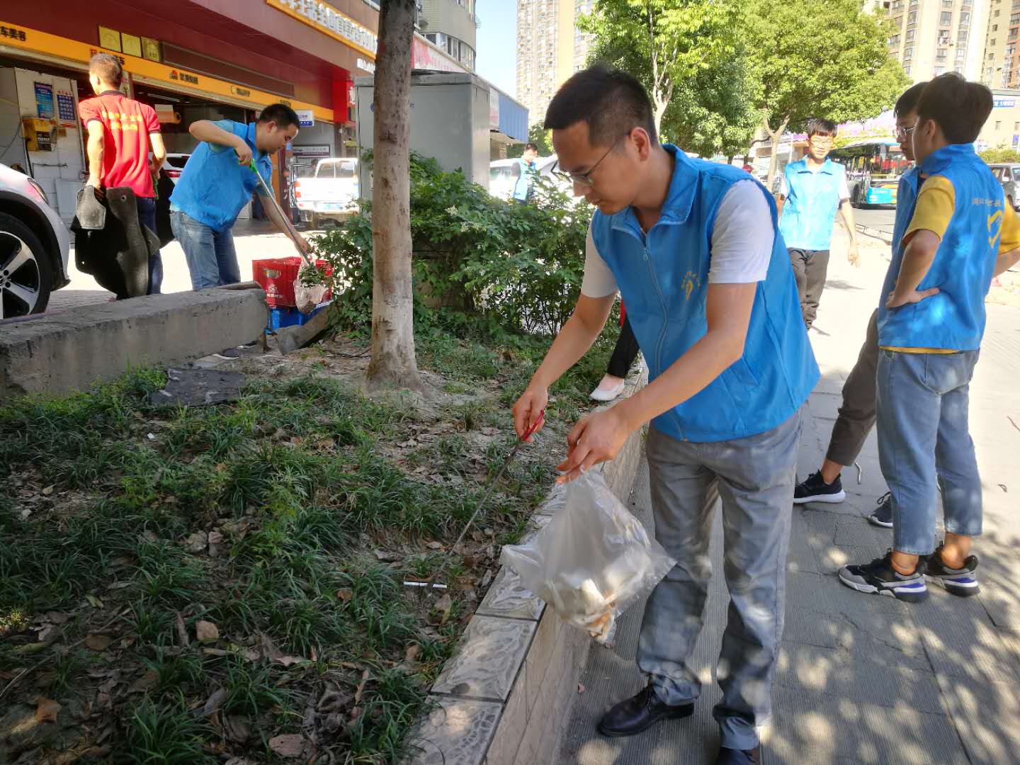 穿上统一志愿者服装,带着分发的劳动工具,大家在社区网格员的带领下,分成三组分别赶赴九号公馆、北京小镇及沿街商铺开展创文志愿服务。大家沿街清理不规范广告、捡拾垃圾、清扫地面,与小区物业人员一同清理杂草,入户向居民开展创文知识宣讲等。尽管天气炎热,汗水湿透了衣背,老师和同学们都干得不亦乐乎,没有一个人叫苦叫累。看着社区环境在大家的共同努力下,变得越来越洁净、文明,大家都感到由衷的高兴。