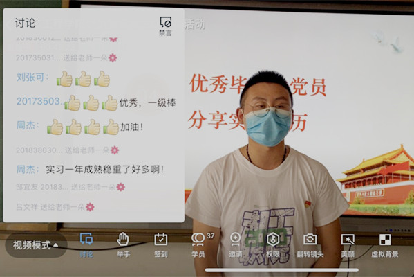 新闻网讯(通讯员 玉声)“当企业加紧生产要求连上两班时,有的人坚持不了选择离开,我也有想打退堂鼓的念头,但想到作为一名共产党员应当迎难而上,于是咬咬牙就坚持了下来……”,在东风小康实习的毕业生党员田金超与大家分享实习经历时感慨地说。6月19日下午,bv伟德国际1946学生党支部通过腾讯课堂直播开展了一场别开生面的“线上+线下”主题党日活动。bv伟德国际1946学生党支部书记曲杉主持此次主题党日活动。党总支书记张玲、副书记梁军萍、学生党小组组长柳海涛以及毕业生党员代表在5307参会,37名非毕业生班学生党员和入党积极分子以观看直播方式参加活动。
