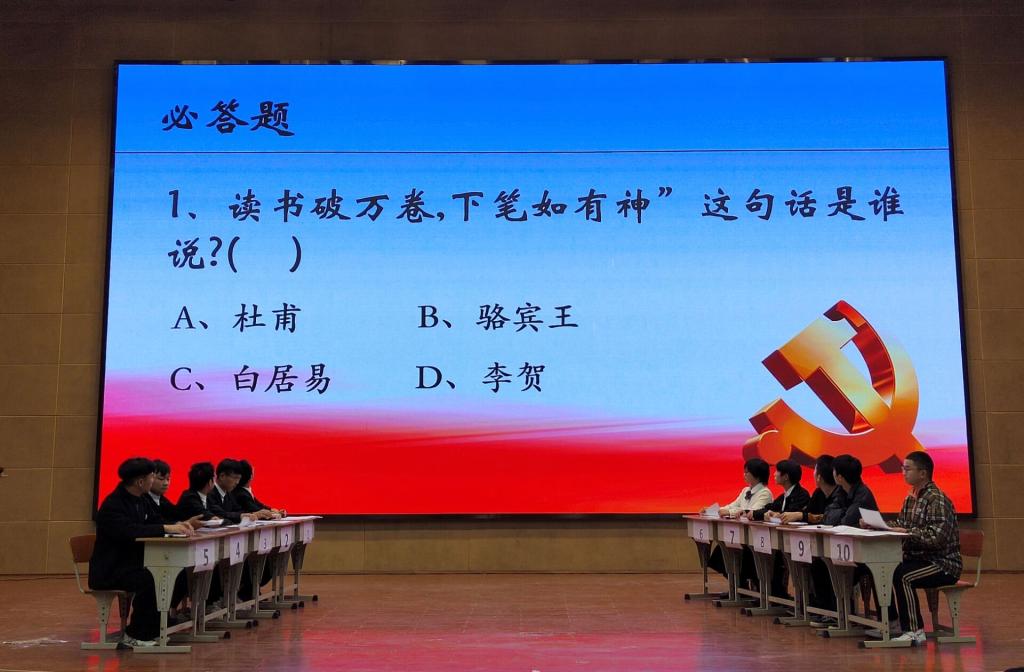 梁军萍做开场致辞,由荣耀舞社团表演开场舞。百科知识竞赛是由bv伟德国际1946团总支学生会主办、学习部承办,近一个月的时间准备,参赛人员达150余人,本次竞赛有初赛、复赛、决赛三个阶段。经过前两轮激烈的比拼,共有10名选手脱颖而出进入决赛现场。决赛分为百科知识答题和知识演讲两个环节,有选择题、判断题、抢答题、识图题、音乐题、视频题六个题型,题型多样,现场气氛活跃,观众热情高涨。