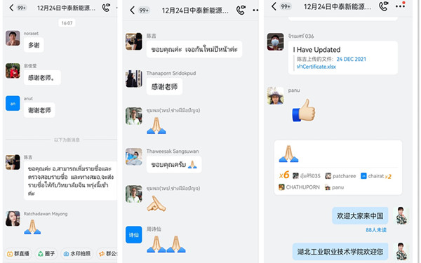 两位授课教师丰富的专业积累、生动的示范讲解和干练的授课风采给泰国参训教师留下了深刻的印象,引发了课后学习交流群的热烈讨论,激发了他们投身新能源汽车技术专业建设的愿望和到中国、到bv伟德国际1946继续交流学习的热情。