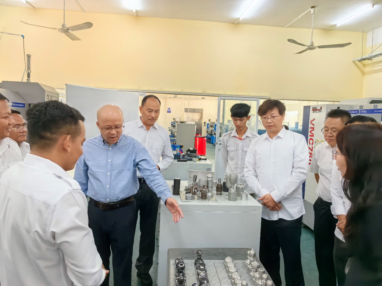 8月17日至19日,代表团访问柬埔寨柴桢理工学院,实地考察了该校实训中心、教室及学生宿舍等教学与生活设施。期间,双方签署了教师外派合作备忘录,并围绕专业建设、实训设备应用、课程开发等议题进行了深入交流。此外,代表团专程走访柬埔寨中国商会,调研中资企业在当地的人才需求以及产教融合实践情况。