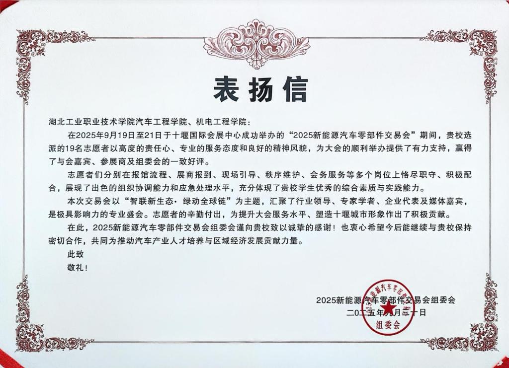 (通讯员李路)近日,bv伟德bv伟德国际1946与机电工程学院收到来自“2025新能源汽车零部件交易会”组委会的表扬信,信中对两学院选派的19名志愿者在全程服务中的卓越表现予以高度肯定。