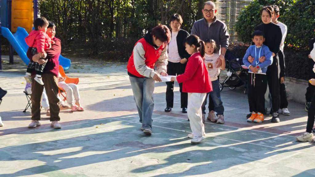 候场间隙,志愿者带着等候的孩子玩起“萝卜蹲”“儿歌接龙”,让等待时光变身欢乐小剧场;颁奖环节,志愿者有序引导家庭登台,将荣誉证书与定制小礼品送到孩子手中,合影时的笑脸定格成社区初冬最暖的画面。截至下午4时,活动圆满落幕,服务队累计提供超45小时志愿服务。
