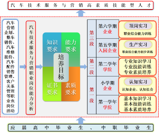 人才培养模式是人才培养的方向舵,针对汽车技术服务与营销专业的岗位特点与高职学生特点,结合多年教学经验,本专业实施职业活动导向“技能三段式”人才培养模式。整个培养过程以学生综合职业能力形成为主线,与企业全程合作,工学交替进行,实现与职业岗位的对接。其中包括拆装调整实训、销售模拟实训、维修接待实训、顶岗实习等多项实践教学,充分训练学生的职业技能。